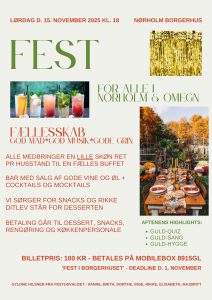 Kan være et billede af drink og tekst, der siger "LORDAG D. 15. NOVEMBER 2025 KL. 18 NORHOLM BORGERHUS FEST FOR ALLE FORALLEI I NORHOLV M & OMEGN FELLESSKAP GOD MAD*GOD MUSIK MUSIK*GODE *GODE GRIN ALLE MEDBRINGER EN LILLE SKON RET PR HUSSTAND TIL EN FALLES BUFFET BAR MED SALG AF GODE VINE OG OL COCKTAILS OG MOCKTAILS VI SORGER FOR SNACKS OG RIKKE DITLEV STAR FOR DESSERTEN BETALING GÂR TIL DESSERT, SNACKS, RENGORING OG KOKKENPERSONALE AFTENENS HIGHLIGHTS: •GULD-QUIZ GULD-SANG GULD-HYGGE BILLETPRIS: 100 KR BETALES PẢ MOBILEBOX 8915GL 'FEST BORGERHUSET' DEADLINE D. 1. NOVEMBER GYLDNE HILSNER FRA FESTUDVALGET SANNE, BRITH, DORTHE, INGE, RIKKE, ELISABETH, MAJBRITT"