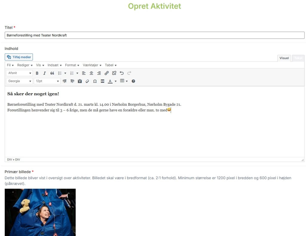 2. Log ind og gå til siden Opret Aktivitet. Udfyld overskrift, beskrivelse, starttidspunkt og upload et billede.